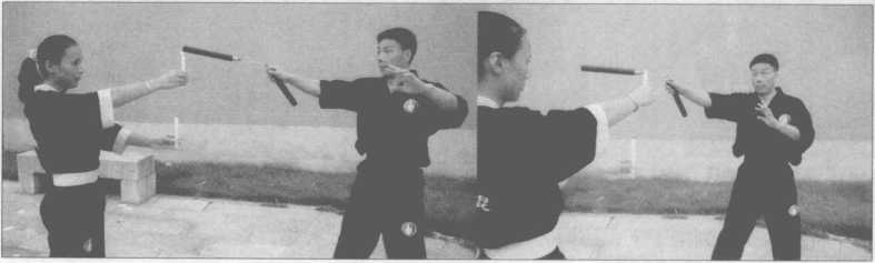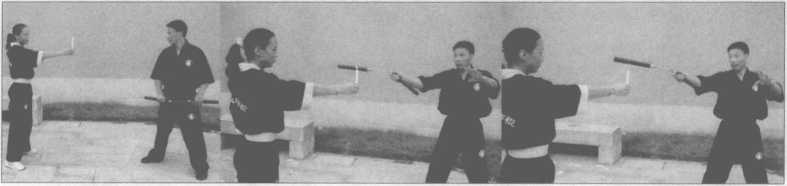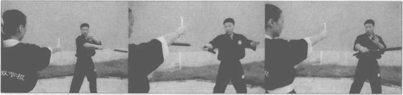 助手手持点着蜡烛站立,练习者运棍横扫蜡烛火焰。刚开始练习先由右至左,熟练 后再练习由左至右,也可以左右连击两支蜡烛(图10-123?130)。