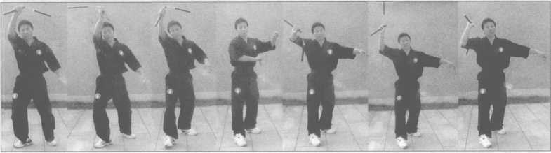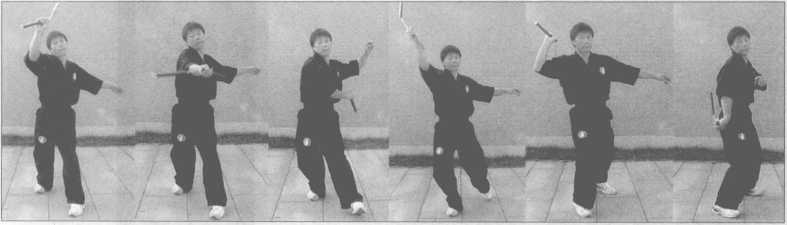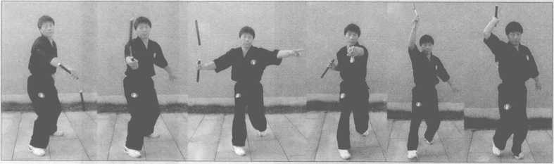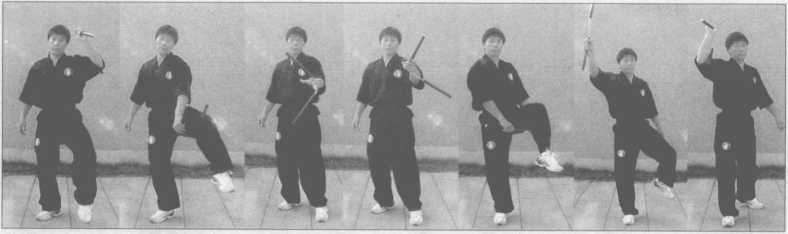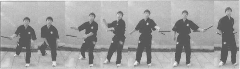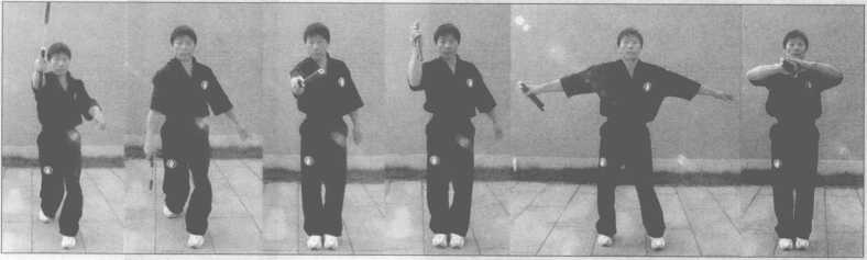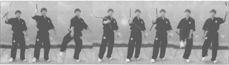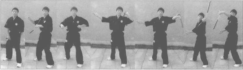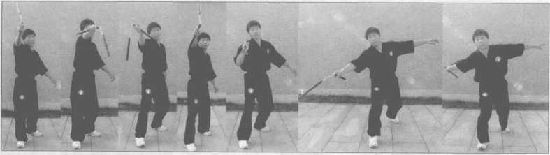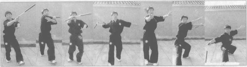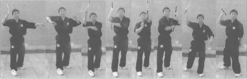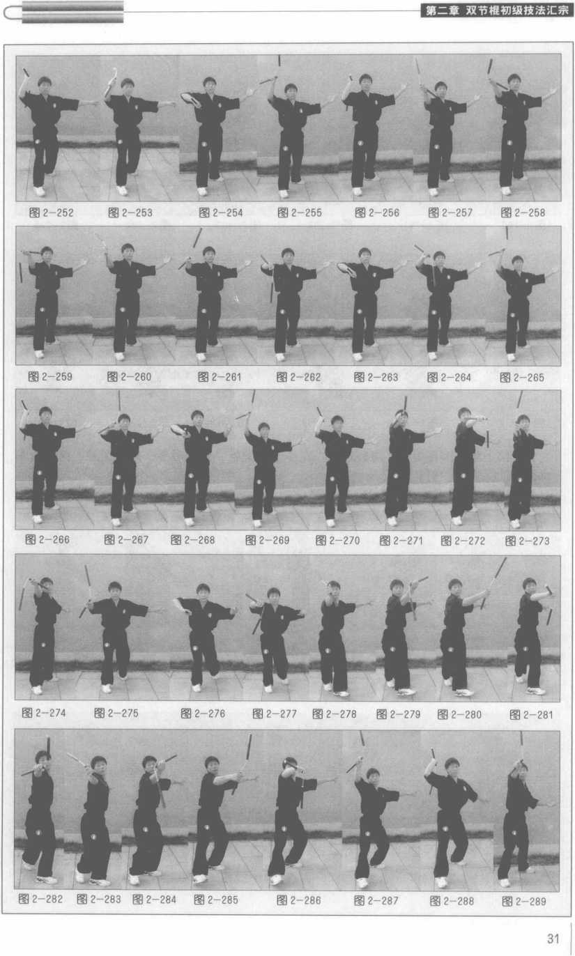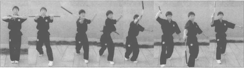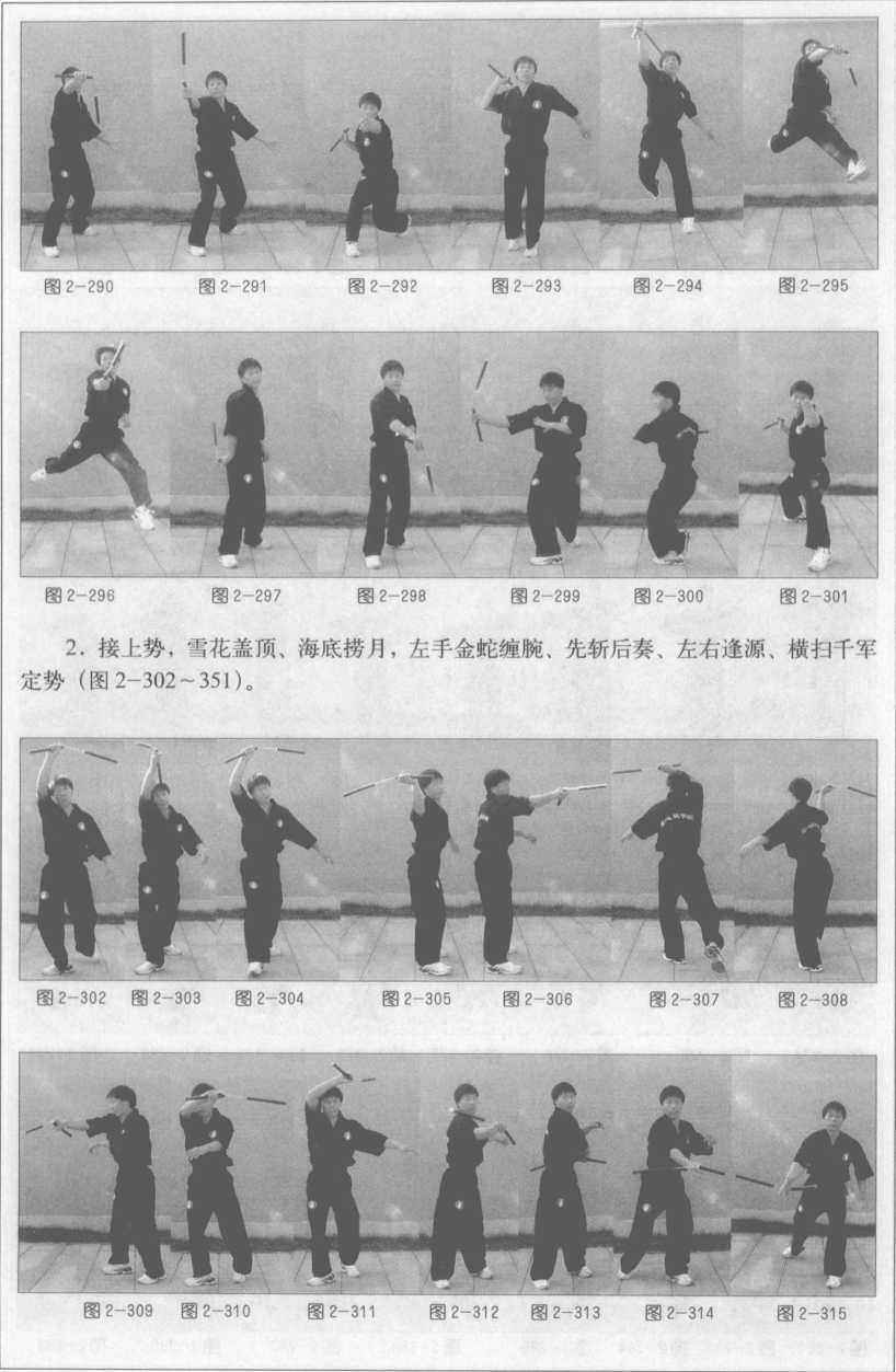 1.抱拳礼,双手擎天起势,挑棍立劈、流星赶月1势、蛟龙翻江、左右逢源1势、上 步2势、夺命追魂、左右逢源3势定势(图2-244?301)。