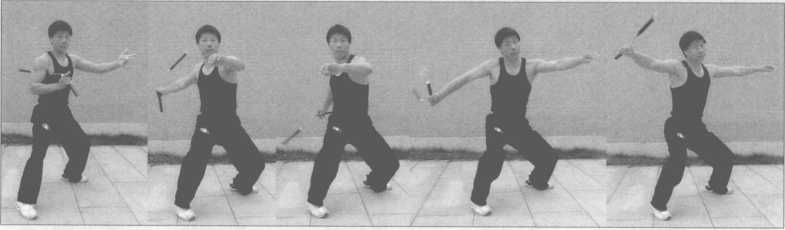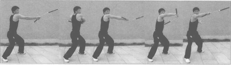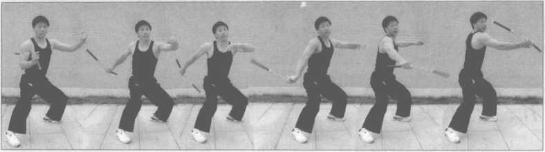 2.此势与1势基本相同,右手棍在右侧做“左右逢源” 3势动作,棍去尽之时向左 侧翻山越岭挥扫,借腰部反弹荡两周平圆,恢复夹棍势(图3-130~144)。