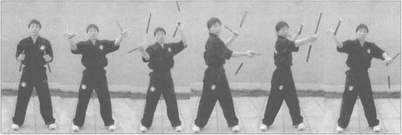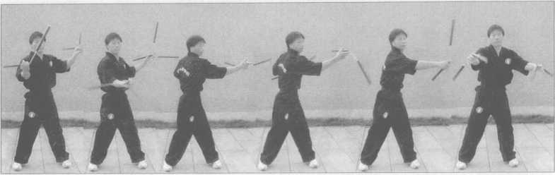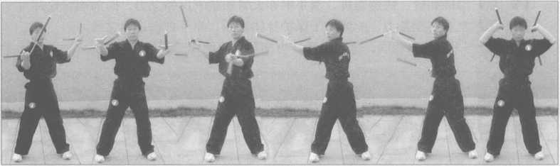 2.此势与1势基本相同,练习时双手同时做螺旋花3势动作,左右手互相转换(图 4—250 ?261)。