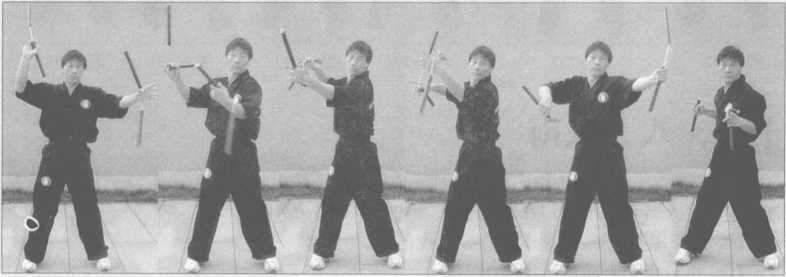 1-夹棍势起,双手各持一棍,同时向前挑棍,一手做螺旋2势动作,一手做改头换 面动作,借大臂和腋下反弹左右互换练习(图4-236?249)。