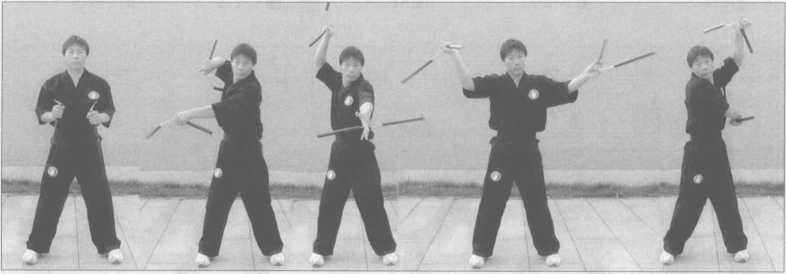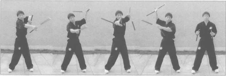 夹棍势起,双手各持一棍,双手运棍同时向上撩棍,借上臂反弹,右手棍向左侧斜 劈,左手做蛟龙翻江动作,右手借腰部反弹,做回头望月2势动作,左右互换练习(图 4-262-271).图4-262 图 4-263 图 4一264 图 4-265 图 4-266图4-267 图 4-268 图 4-269 图 4-270 图 4-271【要点】连绵不断,身体正直,目视前方。【作用】此势用于表演。