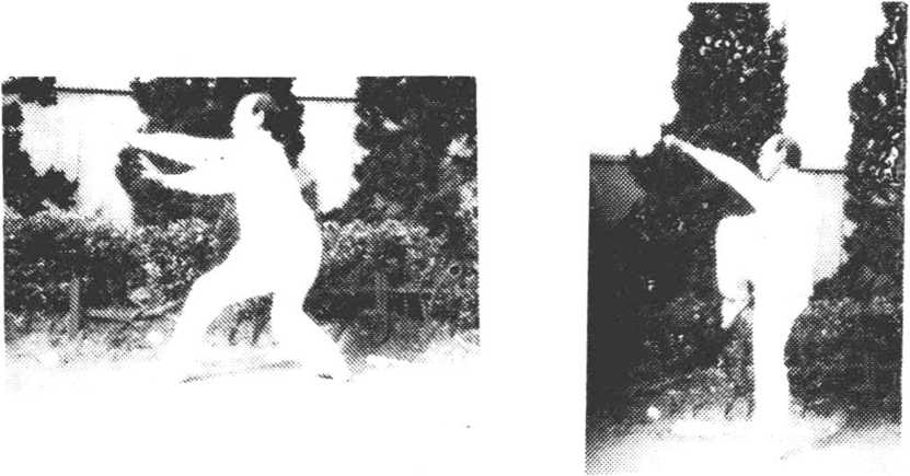 。玉兔蹬鹰 身立起。左拳由上,向右屈臂,挂击于右肋 部,拳心向胸,拳眼向上;右拳直劈置于身后,同时左腿屈膝提 起,脚尖上勾,向前蹬踢,力达足跟,高与腹平o右腿直立,支撑 全身,目视左前方(图71)0