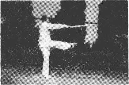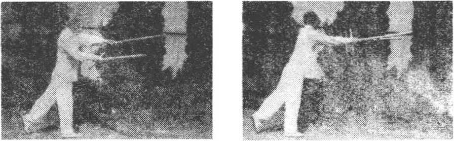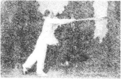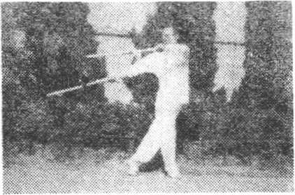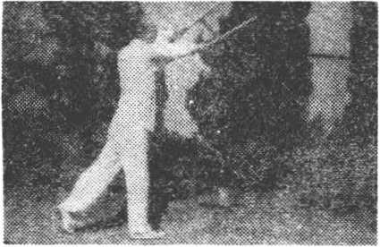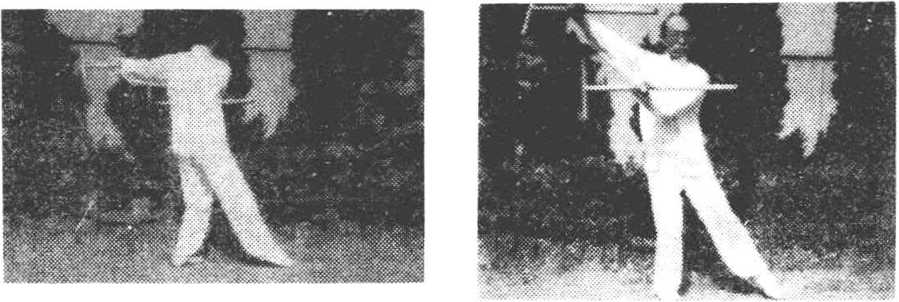 ?退步抡劈猛伸长 左脚套于右腿后,身右转。同时双手 握拐柄部位,经右下方,向后绕环(图14—1),从上向前抡劈, 高与肩齐。拐头向下。身随前移,成右站立步,目视前方(图