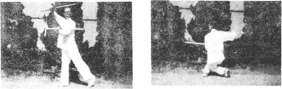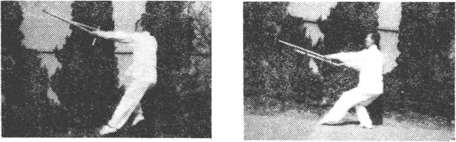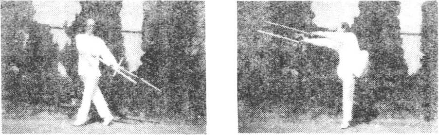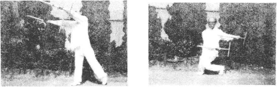?二龙翻滚双劈拐 身立起左转,右拐从左臂上向左后 上方穿挂。身左扭,左拐向下.经后向上穿起,双拐如同二龙翻 滚,摇来摆去,置于左侧后方'(图21--1)。向前进右步,左腿屈 膝提起?成行独立式。同时双拐从上,向前直臂劈打。拐钻向 前,拐头向下,高于肩上。双拐平行,右拐在前,身微前探,目视 前方(图21—2)。