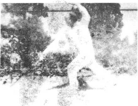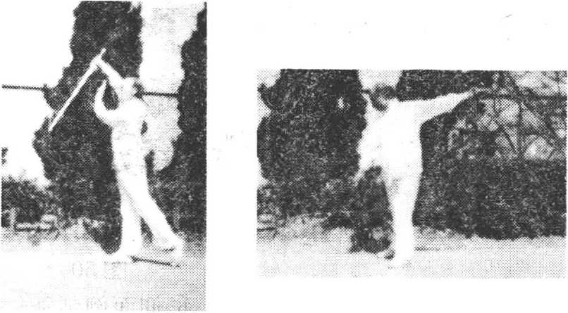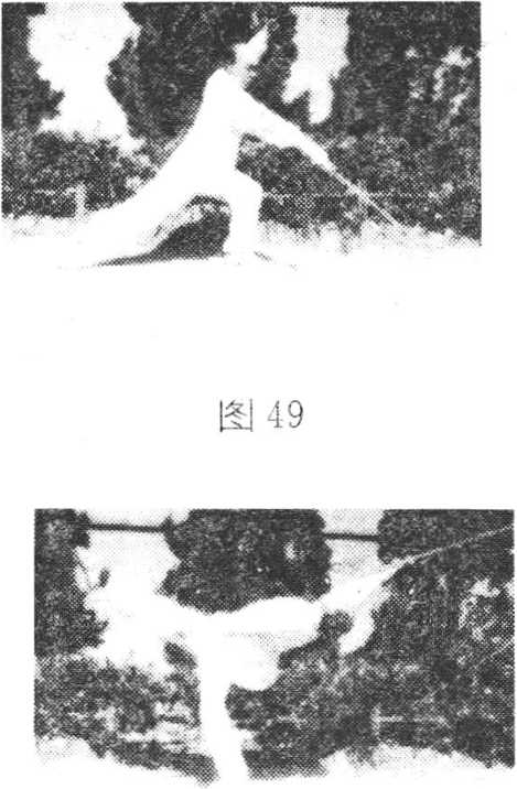 ⑥仰面倒刺剑(仙人过 桥)右腿向前踢起,剑从右 肩上向后倒刺。同时身后仰, 使右腿与身平直。左腿直立, 支撑全身c剑诀向左前方穿 击,与右腿齐,头后仰,目视 剑尖(图51)。