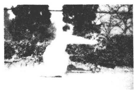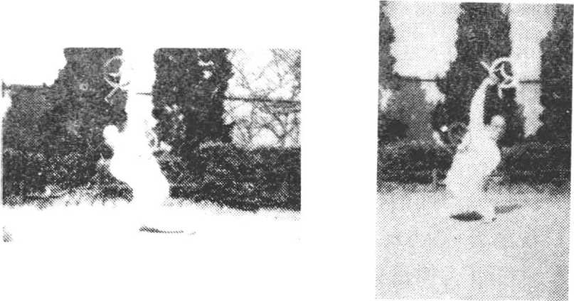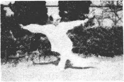 ⑨投步摆圈(古树盘根)身微起?右转,行腿提起向左腿 后盘伸,足尖右勾、身下沉;左腿屈膝?随右腿盘屈卜蹲.行腿 足离地2寸左右,成古树盘根式。同时双平握圈,随戈身向左、 右勾挂。圈高与肩平,目视左前力.(图7)。