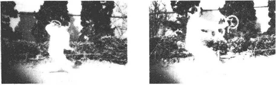 屈,身左扭。同时右手圈由前外旋、屈臂挂勾于胸前,拳心向 上;左手圈由前内摆,屈臂勾挂于左肩外侧(图ll-l)o上动 不停。上右步,成右虚步,双圈经腹直臂向前挑刺,圈高与肩 平,圈刃向前,翅上下竖直,目视前方(图11—2)。