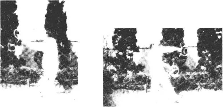 不停。左脚左落,足尖点地,身右扭。双圈由上向左侧下挂摆。 身继续右转,双圈经前下向右上侧挂摆(图16—2)。同时右腿 提起(同图16—3)。身右转,双圈直臂向右上方撩削,拳心相 对。左腿直立,支撑全身,目祕L左上方(同图16—4)。