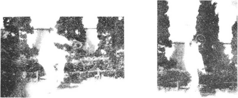(蛟龙摆尾)左脚向左落,足尖点地.身 右扭。双圈由上向左下侧挂摆,目视双圈(图16—1)。上动不 停。身右转,双圈经下,向右上侧挂摆(图16—2)。同时右腿提