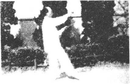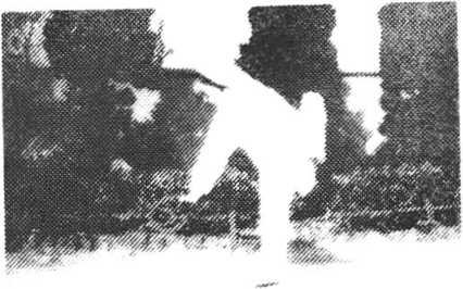 由左腋下经胸向右下侧直臂劈朵I」,高于膝下,圈刃向右,翅上 下竖直;左手圈格架于头上方,圈刃向前,翅上下竖直c右腿直 立,支撑全身,目视右前方(图18)。