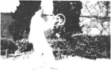 左脚前落,足尖向前.身F沉。同时右手圈由右向头上勾挂,左 手圈向右腋下勾挂。圈刃向上,翅斜向右左,拳,心相对.目q前 上方(看图9)。