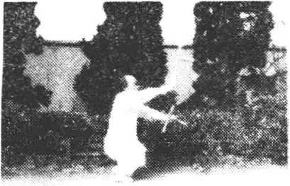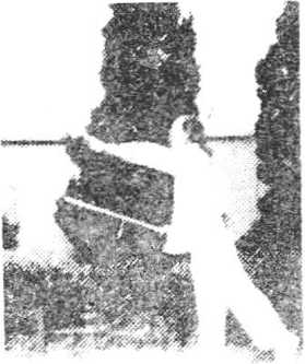 N步,身右转180。,成右站立步。右 户拐由前向上劈打勾挂于身右侧, 另头向下,拐钻向前;左手拐随转 方由前向左上方甩劈。乘甩拐手握 另柄部位.直臂擎于左上方.拐头向 熊目视前方(图73)c