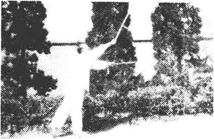 与钻捣拐柄学奇正 左脚前落地,成左站立步。左手握拐 把部位,向左前方击拐柄.高与胸平.拐头向右。同时右手拐向 前,钻捅拐钻,高与肩平,拐头向右。右手握拐在上、目视左前 方(图70)。