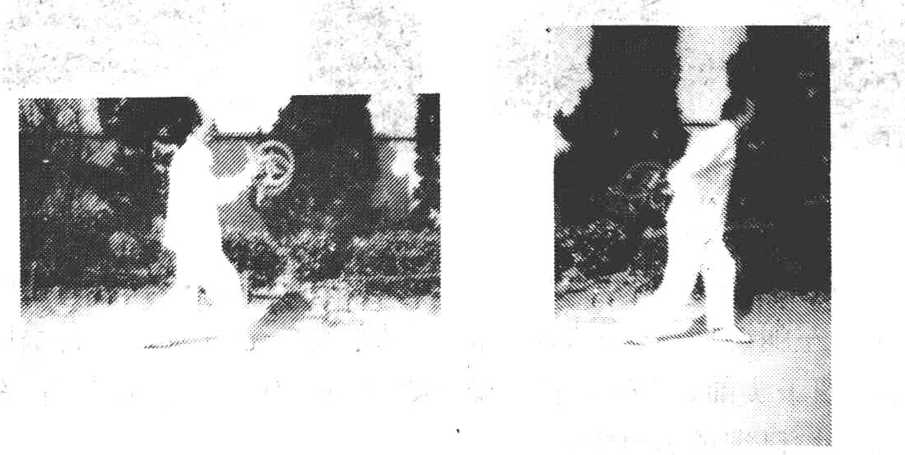 ?进步前摆后挂圈(孔雀开屏)双圈由左右向胸前摆 拿,身跟随前移(图36二1)。继续进左步,双圈由胸前向左右 直臂摆挂于身后。双拳心相对,目视前方(图36—2)。