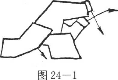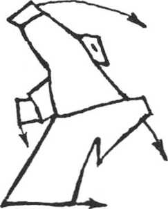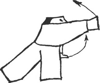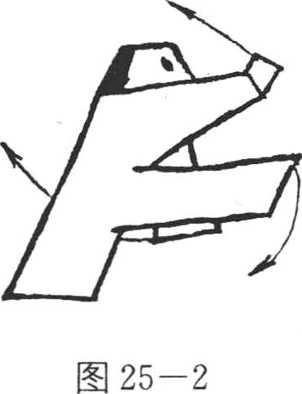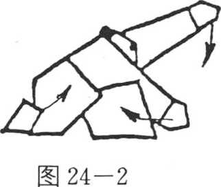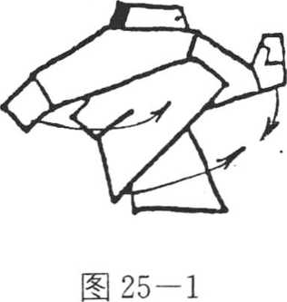 ?钻晃鸡腿崩砸拳 左脚上步屈蹲,右腿原地跟步成鸡 腿步,同时左拳内旋、向上,由须下向前上钻晃象鼻拳,拳眼 向右下,高于头梢,右拳外旋下落(图24-1),向左膝前下反 击,低于膝下,拳背朝下,拳眼向右,目视前方(图24—2)。