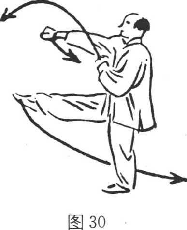 同时左掌变 拳由右小臂上向前向左格击,拳心向上,高与肩平。身跟随上 挺微左转,右拳附于左肘内,拳心向下,目视左拳(图31)。