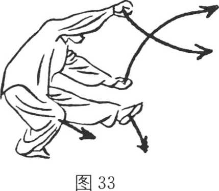 ③左踢右崩拳下砸 右腿下蹲,左脚微提勾脚尖由左向 右前撬扫,脚尖斜向上,高与膝平。同时,右拳内旋向前反崩击 于面前,拳背向左,拳高于眉梢;左拳由后外旋向前反砸击于 胸前,拳背向右。两拳眼皆斜向下,目视前方(图33)。