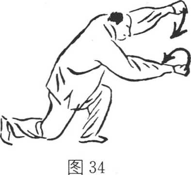 拳眼向下;右拳外旋向前下砸击,拳与左膝平,臂直,拳背向 下,目视左拳(图34)。