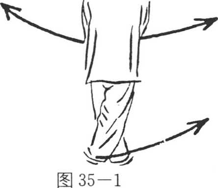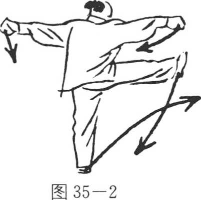 颔侧身蹬踹拳双撑 身立起左转90。,两拳交叉于腹前, 左拳在上,拳心皆向腹,目视右方(图35—1)。上动不停,左腿 直立,右脚勾脚尖,侧身向右前方蹬踹。同时,两拳向左右侧撑 击,拳心皆向下,高与肩平,目视右拳(图35-2) 0