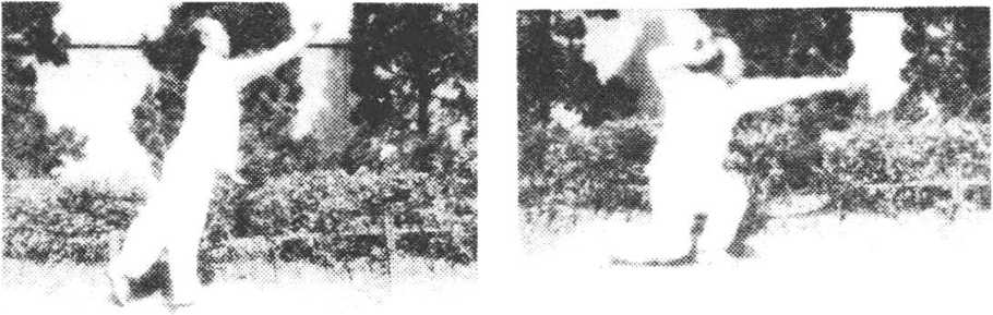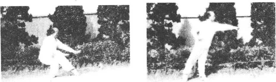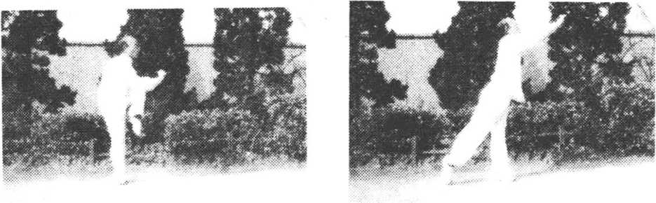 ④右步再进击须端 向前上右步,成右站立步,右拳由下 向前上崩,猛击敌人之颗端,拳心向内,高与头平。同时,左掌 向内划弧,与右臂相错时,左指拍右臂出声护裆,掌心向下,指 向右,目视右拳(图4)。