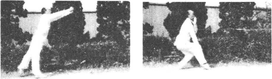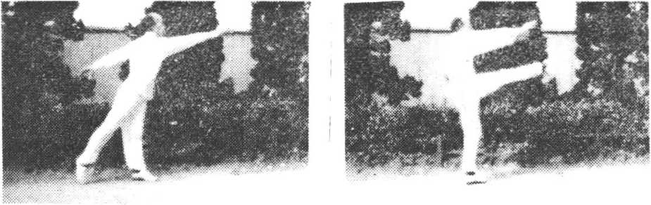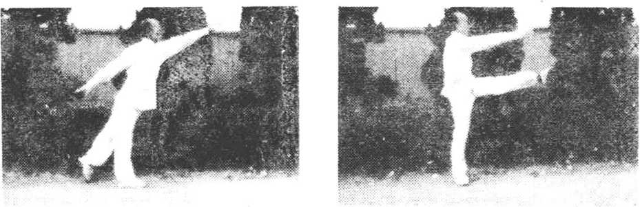 方,左掌前劈(图66 — 1)。左腿提起向前平踢,足尖勾向右方, 高于腹部,力达足面。右掌跟随由后向上、向前劈击,左掌经胸 前向上劈击,右脚同时前垫一步,目视左拳(图66—2)。