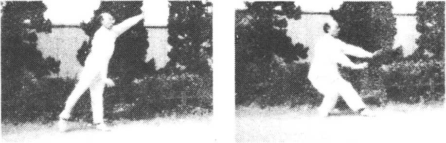 ?落步顺势双撩捶 右脚前落地,成右站立步。同时双掌 变拳,以拳背向前撩击对方胸部,高与肩齐,拳背向外,目视前 方(图70)。