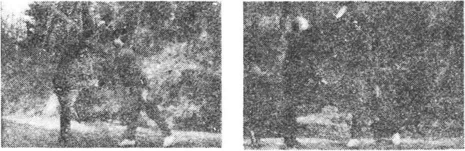 左拳外旋,用拳背向右腿外 侧砸击,拳眼向左前,高于膝 上,位于右腿外侧,目视乙方 (图 23)。