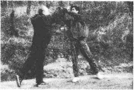 图26上;右拳在左掌外挑时,右臂 竖起,上举。当右拳举高,立 即向前晃扣乙前额、头部,拳 心向下,?高与眉齐。两腿原 地,上身微前探,目视乙方 (图 26)。