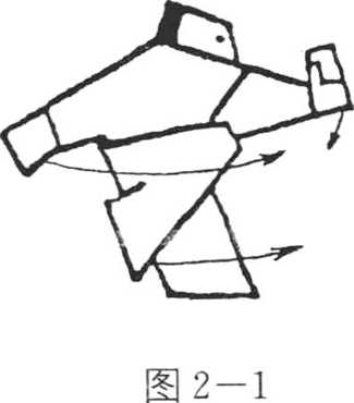 ②紧跟弹腿上崩拳向左转 体90。,左脚上步落地、直立支持 全身重力,右腿曲起,两臂下落 (图2—1)。上动不停,右脚趁势 向身前弹踢,力达足尖,高与脐 平。同时,右拳由后经右下侧向前 上方崩打,拳背向上,高与头平: 左拳变掌下落经右臂时,指尖擦