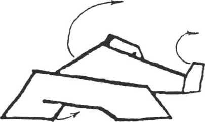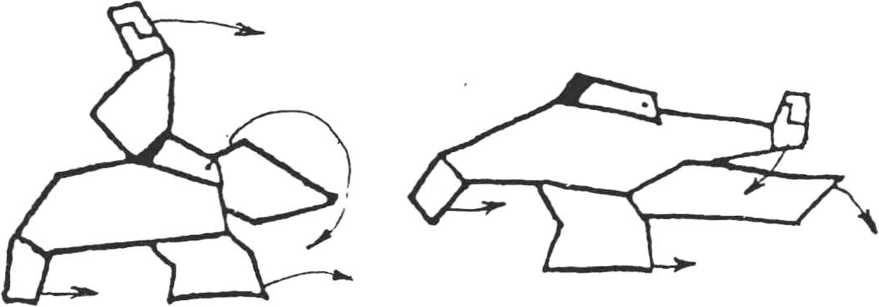 ⑤捶分上下鸡腿步 左腿前引落地,左膝微弓,右脚跟步 屈弓,左掌变拳,右拳由后屈肘于右胸侧,左拳由前后屈肘于 左膝前(图5—1)。身向前左扭90°,双拳屈于左右耳侧(图5-