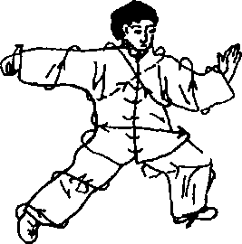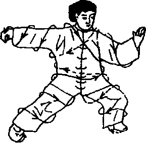 在此式中,起初,缠丝劲起于两脚大趾,而止于两手 中指。起于右脚大耻的缠丝劲到达左手中指。起于左脚 大趾的缠丝劲到达右手中指。此时,在脚上的缠丝劲为 顺缠,而在两手臂上的为逆缠(见图3-6③)。在此式将