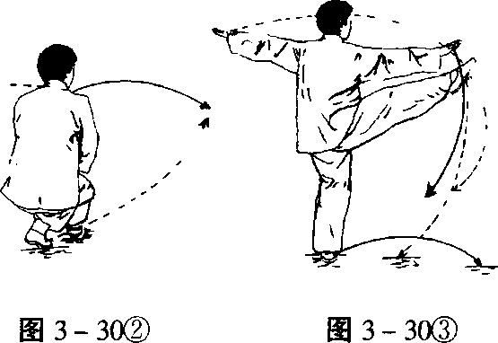 ① 左脚向右脚右边盖上一步,歇步。同时,两掌在膝 前交叉,右掌在外,两掌心向内,身法蹲下(见图3-30 ①)。