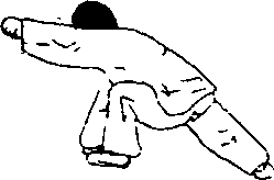 假设敌从正面击我,我即左手缠住敌右手向左引开。 我右手护住胸,用右臂缠住敌左手,俯身下去,以头击敌 之胸部。同时,右手插下,搬敌之腿,使敌仰天摔倒。