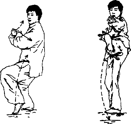 ① 左手逆时针走一圈,右手顺时针走一圈;两臂在胸 前相交,右臂在外。同时重心移至右腿,提左脚(见图4 -30(D)。