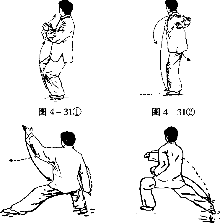 展发劲,两拳变掌(见图4-31②)。 _