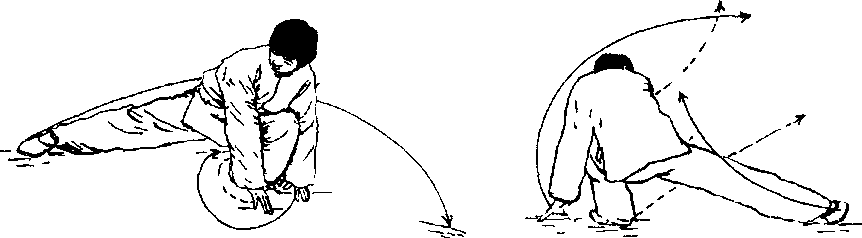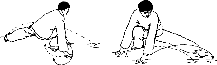 ③身法继续右转,双手移至左脚前撑住地(见图4- 33③)。