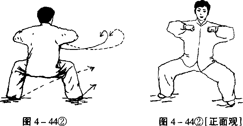 ② 身法向右侧跃 起,左脚向右侧盖步, 落地。右脚随即在左 脚右边一肩宽处落地, 成马步。同时两掌向 上向内运至胸前,握拳 屈肘,逆缠劲,两肘向 左右两侧击出(见图4 -44?)O