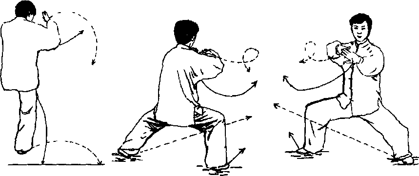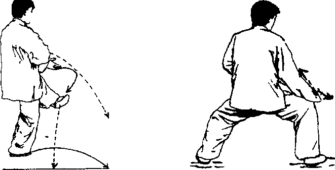 ①两手向下左右分开,同时提左脚向右腿右侧准备