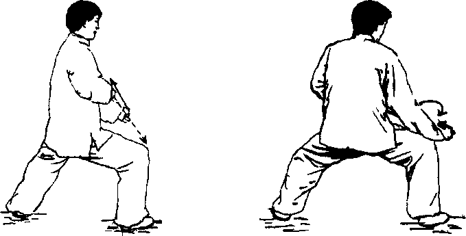 ②身法跃起,左脚盖步于右脚右侧。右脚随之落于 左脚边一肩宽处,马步。同时右臂屈肘逆缠后拉助左掌 前击,左掌逆缠向正前方发劲(见图4 - 45②)o