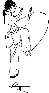 步法:左腿渐渐起立;同时,右腿屈膝提 起,脚尖自然下垂。