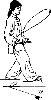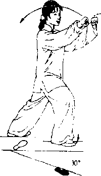 〔动作一:收腿落掌〕身法:上体右转。步法:左腿继续独立站稳;右小腿回收下落 屈膝平举,脚尖自然下垂。手法:两掌渐外旋:左掌由后向上、向前划 弧与右掌在面前会合后(同头宽)再 下落至体前;同时,右掌由右前向里 划弧、与左掌会合后分落于右膝两 侧,掌心'向上。眼法:目视前方。〔动作二:迈步分掌〕身法:上体继续微右转。步法:左腿渐屈半蹲;同时,右脚向右前方 (东偏南约30。)前迈,脚跟着地,脚 尖上翘。手法:两掌同时向下、向外划弧至两胯侧, 掌心斜向上。眼法:眼移视左前方。