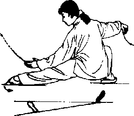 步法:右腿慢慢屈膝下蹲;同时,左脚由内 向左侧(偏后)伸出,全脚着地,脚 尖里扣(左脚尖与右脚跟踏在一条中 轴线上)。