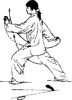 腿屈膝提起与右掌上挑也好象有一线相牵似的相随一致,右掌上挑与 左掌向下采按两臂要有对拉拔长、曲中求直之意。