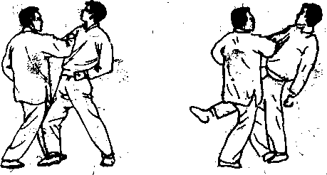 甲方用右拳攻击乙方胸部,乙方用左手抓握其腕并向后 拉引(图4-17),当甲方欲向后回拉右臂时,乙方顺势用右前 臂搠击甲方肋部,将甲方棚出以至倒地(图4-18)。图 4-17匕 图 4-18