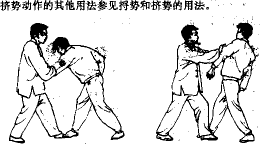 捋变挤甲方拗弓步左拳攻击乙方胸部,乙方顺势向左后方捋引 0 4-76),当甲方感到对己不利而欲回抽左臂肘;乙方松开 右手而贴靠甲方上臂上一,同时左腿蹬地用左手挤击甲方上臂, 将甲方挤出或当甲方回抽时顺势挤击甲方胸部(图4-77)。捋 74 -图4-76捋挤式 图4-77