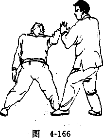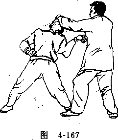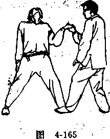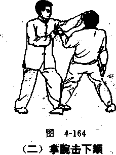(―)拿鼻、甲方用左推掌推击乙方胸部,乙方用右手由里抓握其手 指(图4-162)并向外拧转,用左手扣握其腕,(图4-163),随 即用左手发钻拳(拳心向上)攻击甲方鼻部(图4-164)。图4-162上步擒打图4-162上步擒打图 4-163,图 4-163,图4-162上步擒打图4-162上步擒打图 4-163,图 4-163,甲方用左推掌推击乙方胸部,乙方用右手由来掌之外侧 抓握其手指(图4-165),并向外拧转,用左手扣压其腕,(图 4-166),随之用左拳贯击其头部(图4-167)。