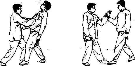 甲方用双撞掌或双冲拳或双峰贯耳攻击乙方头部或胸 部,乙方用双手向上向外分挑(图4-168)转挂压(图4- 100