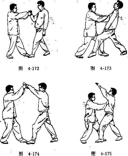 乙方左手被甲方右手抓住(图4-171),艺方用右手推抹 解脱(图4-172),随即用双手推击甲方胸部(图4-173).