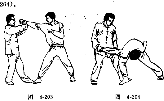 (-)十字架挡甲方用左冲拳攻击乙方头部,乙方用双手在脸前十字架 挡(图 4-202),(-)十字架挡变拿肘甲方用右冲拳攻击乙方面部,乙方用右手在左手下的十 字架挡(图4-203),随即乙方右手反握甲方右手腕外旋拧转, 111*,.图4-202十字手,左手由外向内滚压推转甲善右肘,携甲方拿于身下(图4-